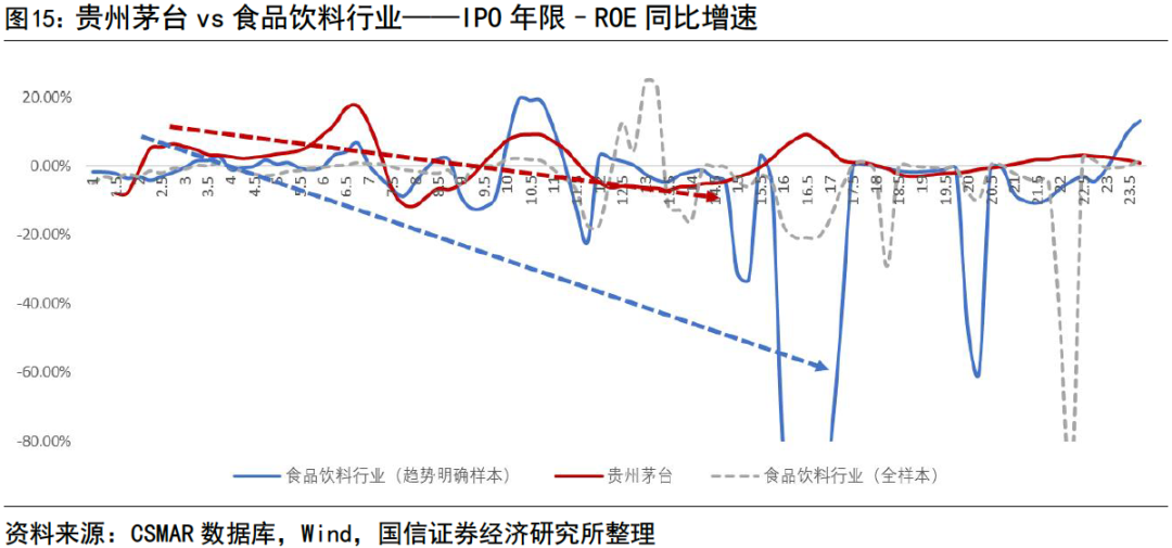 在國信證券的個股篩選中,貴州茅臺是優(yōu)于行業(yè)的代表樣本。盡管從統(tǒng)計判定上被歸類為第一階段,但其ROE演變路徑已經(jīng)呈現(xiàn)出向第二階段過渡的形態(tài)。從ROE隨IPO年限變化的軌跡來看,貴州茅臺在第一階段便與食品飲料行業(yè)拉開差距。與行業(yè)樣本相比,其ROE同比增速的下降斜率明顯更緩,未出現(xiàn)深度回落。在行業(yè)進(jìn)入盈利承壓期時,貴州茅臺并未經(jīng)歷典型的規(guī)模擴(kuò)張和盈利攤薄,而是依托強(qiáng)品牌力與穩(wěn)定的需求結(jié)構(gòu),將盈利調(diào)整控制在可承受范圍內(nèi)。貴州茅臺的拐點(diǎn)出現(xiàn)得也明顯早于行業(yè)。大約上市后第14年左右,其ROE增速已率先企穩(wěn)并進(jìn)入修復(fù)通道,而食品飲料行業(yè)整體仍處于震蕩階段。這與公司商業(yè)模式密切相關(guān):在行業(yè)普遍依賴規(guī)模擴(kuò)張和渠道鋪設(shè)時,貴州茅臺已完成從量的增長向價與結(jié)構(gòu)的優(yōu)化的轉(zhuǎn)變,盈利彈性開始內(nèi)生釋放。