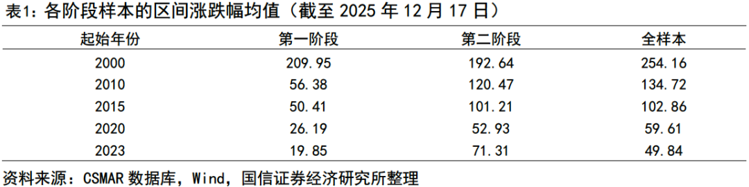 趨勢識別是精準(zhǔn)判定個股盈利生命周期的基石。在實(shí)證研究的第一步,國信證券利用二次函數(shù)對全A樣本進(jìn)行回歸,剔除異常值后共有1273只個股展現(xiàn)出顯著的U型特征,占比約23%。通過對二次項(xiàng)系數(shù)的顯著性及拐點(diǎn)位置判定,將樣本劃分為第一階段(壓力期)241只潛力股與第二階段(修復(fù)期)1032只績優(yōu)股;販y顯示,除受超長周期狀態(tài)遷移噪聲干擾的2000年起始的樣本外,其余窗口期(2010/2015/2020/2023年起始到2025年12月17日)的第二階段漲幅均顯著大于第一階段,其中2023年以來第二階段的樣本漲幅約為第一階段的3.6倍,充分驗(yàn)證了盈利生命周期范式的實(shí)戰(zhàn)價值。