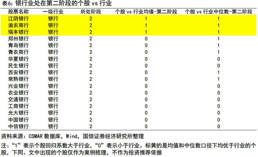 銀行業(yè)作為成熟行業(yè)的特征得到充分印證,大多數(shù)銀行股已跨越盈利拐點(diǎn)進(jìn)入第二階段。農(nóng)業(yè)銀行、工商銀行與中國銀行均呈現(xiàn)第二階段的修復(fù)特征,盡管其ROE增速在長周期內(nèi)一波三折,但盈利中樞已展現(xiàn)穩(wěn)健的回升態(tài)勢。僅招商銀行與蘭州銀行(001227)被判定為第一階段。招商銀行作為零售轉(zhuǎn)型的標(biāo)桿,在經(jīng)歷長期的超額增長后,近期ROE增速隨資本周期的更迭進(jìn)入壓力區(qū)間,正處于尋找新增長動能的磨底過程;而蘭州銀行受制于上市年限較短及區(qū)域經(jīng)營環(huán)境調(diào)整,盈利曲線仍處于下行通道。通過將個股回歸系數(shù)與行業(yè)基準(zhǔn)對標(biāo),在處于第二階段的銀行股中,篩選出江陰銀行(002807)、渝農(nóng)商行(601077)與瑞豐銀行(601528)三家盈利修復(fù)趨勢強(qiáng)于行業(yè)平均水平和中位數(shù)的銀行。