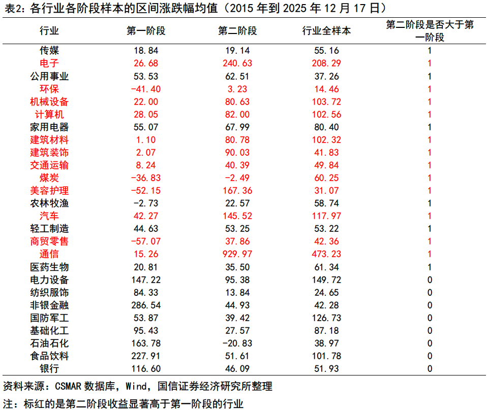 進(jìn)一步下沉到行業(yè)層面,盈利周期的驅(qū)動邏輯在絕大多數(shù)行業(yè)中具備極強(qiáng)的穩(wěn)健性。以近十年(2015-2025)的收益表現(xiàn)作為聚類基礎(chǔ),在具備有效樣本記錄的26個行業(yè)中,有18個行業(yè)的第二階段個股漲幅超過第一階段。在TMT、中游制造及下游可選消費(fèi)等高彈性板塊中尤為突出,相比之下,大金融、必選消費(fèi)等防御性板塊對該邏輯的敏感度較低。整體來看,U型曲線下的盈利修復(fù)邏輯在全市場范圍內(nèi)具備極高的勝率與普適性,為我們后續(xù)在行業(yè)內(nèi)部進(jìn)行自下而上的個股篩選提供了穩(wěn)固的中觀依據(jù)。