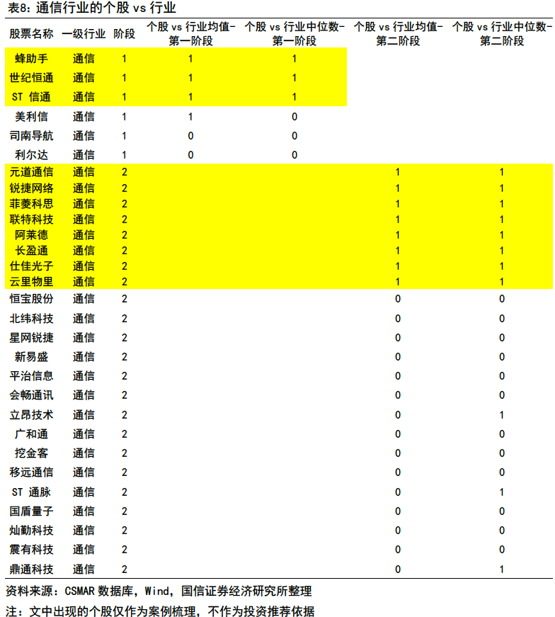 通信行業(yè)的周期階段分布較為均勻。個股層面上,蜂助手(301382)、世紀(jì)恒通(301428)、ST信通(600289)的表現(xiàn)優(yōu)于同處于第一階段的行業(yè)均值和中位數(shù);元道通信(301139)、銳捷網(wǎng)絡(luò)(301165)、菲菱科思(301191)、聯(lián)特科技(301205)、阿萊德(301419)、長盈通、仕佳光子、云里物里優(yōu)于同處于第二階段的行業(yè)均值和中位數(shù)。
