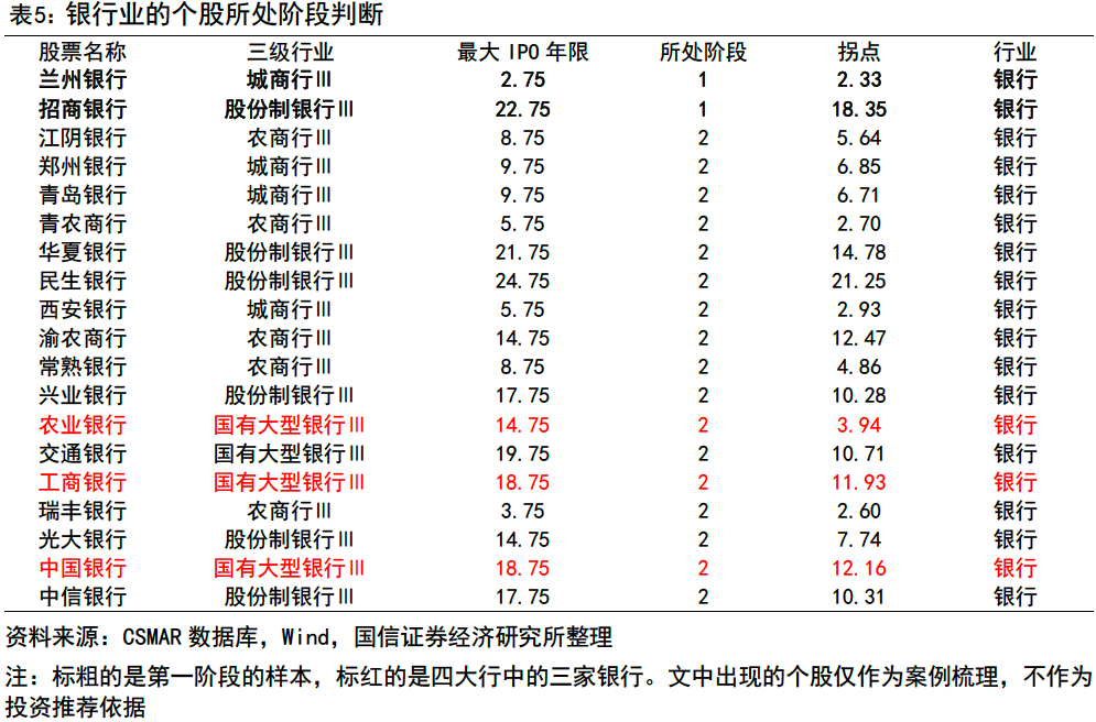 全市場樣本的平均上市年限為12.63年,出現(xiàn)拐點(diǎn)的平均年份為第6.62年。少數(shù)個股在回歸中出現(xiàn)負(fù)拐點(diǎn),可能因?yàn)樵谏鲜兄跻烟幱谟厣ǖ溃瑢?dǎo)致數(shù)學(xué)擬合的拋物線拐點(diǎn)落在Y軸左側(cè)。剔除這類樣本后,全市場平均拐點(diǎn)上移至第9.32年,這與我們直覺中的8-10年高度吻合。為規(guī)避近年新股上市對平均值口徑的稀釋影響,引入中位數(shù)進(jìn)行檢驗(yàn),IPO年限和拐點(diǎn)年份的中位數(shù)分別為9.75年和5.07年(剔除負(fù)拐點(diǎn)后為5.53年)。