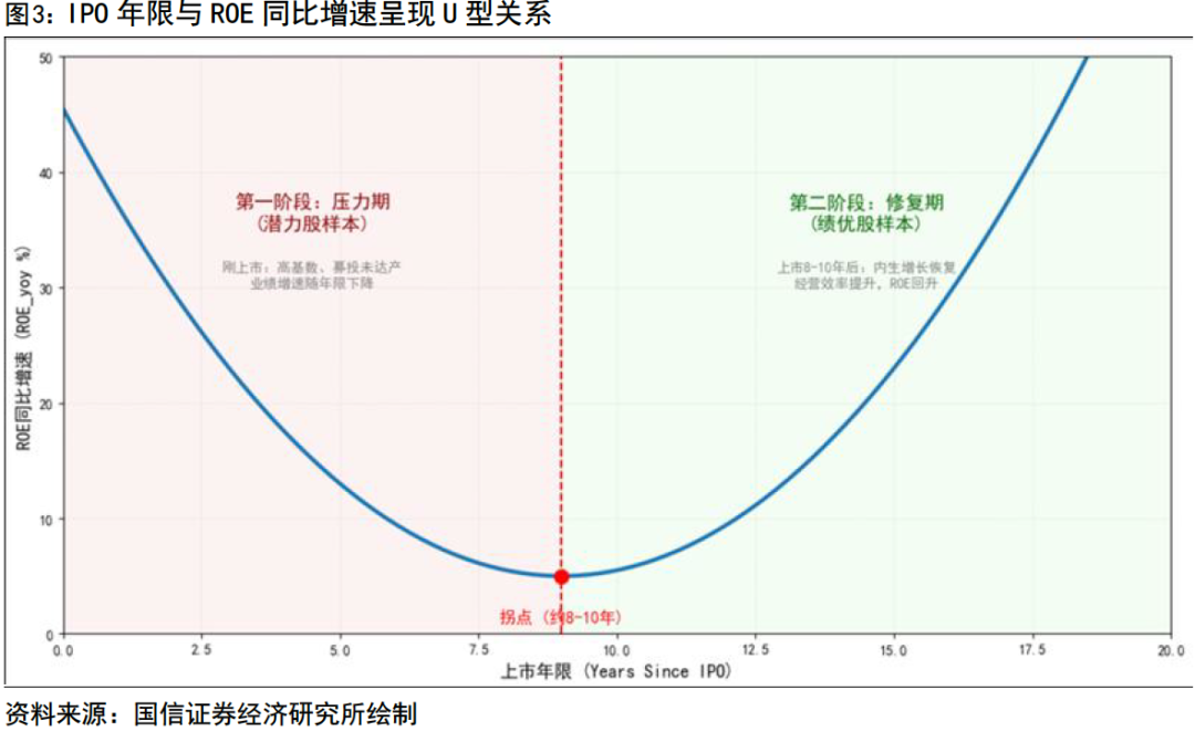 A股市場同樣存在IPO全生命周期的盈利演變邏輯。企業(yè)在上市初期往往面臨高基數(shù)消化、募投項(xiàng)目建設(shè)期投入以及融資后凈資產(chǎn)攤薄等多重壓力,導(dǎo)致其ROE同比增速隨上市年限增加呈現(xiàn)階段性回落,進(jìn)入第一階段(壓力期),這一階段的樣本可視為潛力股;而在企業(yè)上市跨越約8至10年的關(guān)鍵臨界點(diǎn)后,隨著行業(yè)出清以及公司治理成熟,優(yōu)質(zhì)標(biāo)的往往能實(shí)現(xiàn)盈利能力的觸底反彈,從而進(jìn)入業(yè)績與估值雙修復(fù)的第二階段(修復(fù)期),在這一階段的樣本可視為績優(yōu)股。這種由降轉(zhuǎn)升的動態(tài)軌跡,勾勒出ROE增速與IPO年限之間的U型關(guān)聯(lián)。